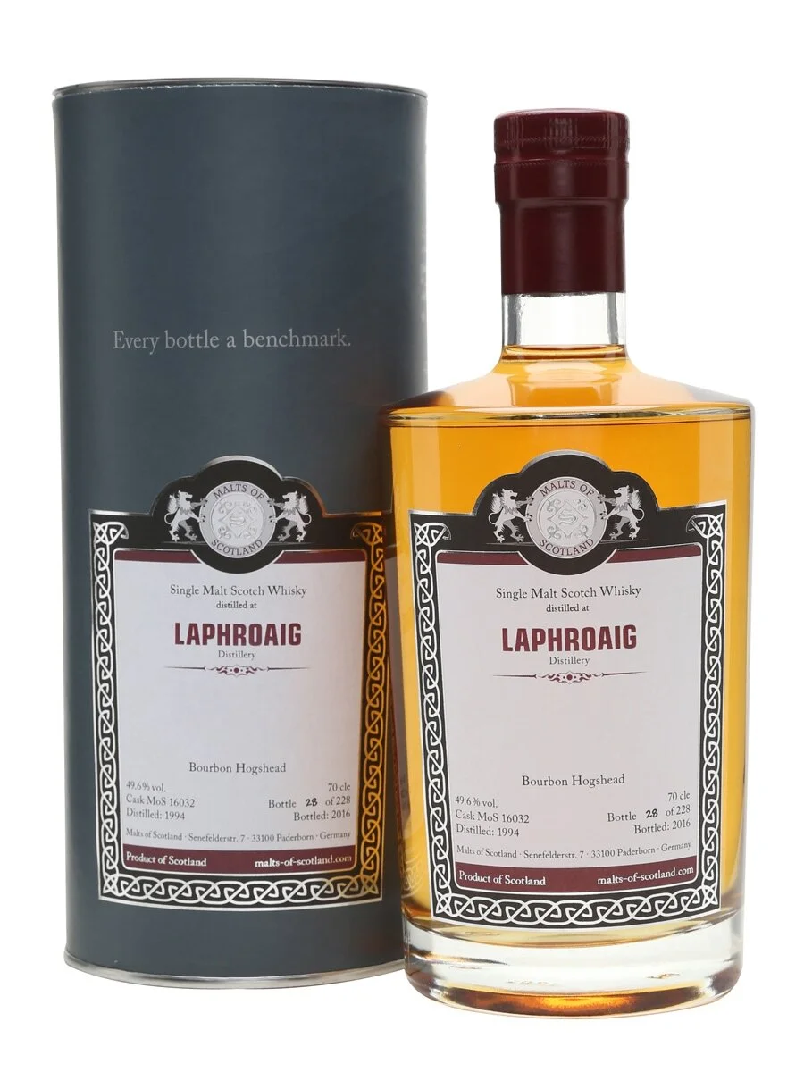 Laphroaig - Malts of Scotland Bottling - Ex-Bourbon Finish 22yo (SET A). We love the Malts of Scotland independent bottlings, and it's important to note that independent bottlings of Laphroaig are becoming increasingly rare, since my understanding is that Laphroaig put a full stop to it to keep up with demand for their official bottlings years ago. We picked up two of these Laphroaig Malts of Scotland bottlings, so for those of you who opt for SET A (the 30yo expression), you'll get this one, which is a whopping 22 years old, one of only 228 bottles released and matured entirely in an ex-bourbon hogshead, bottled at a delightful 49.6% abv. Cask 16032 for those that are counting, distilled 1994, bottled 2016.